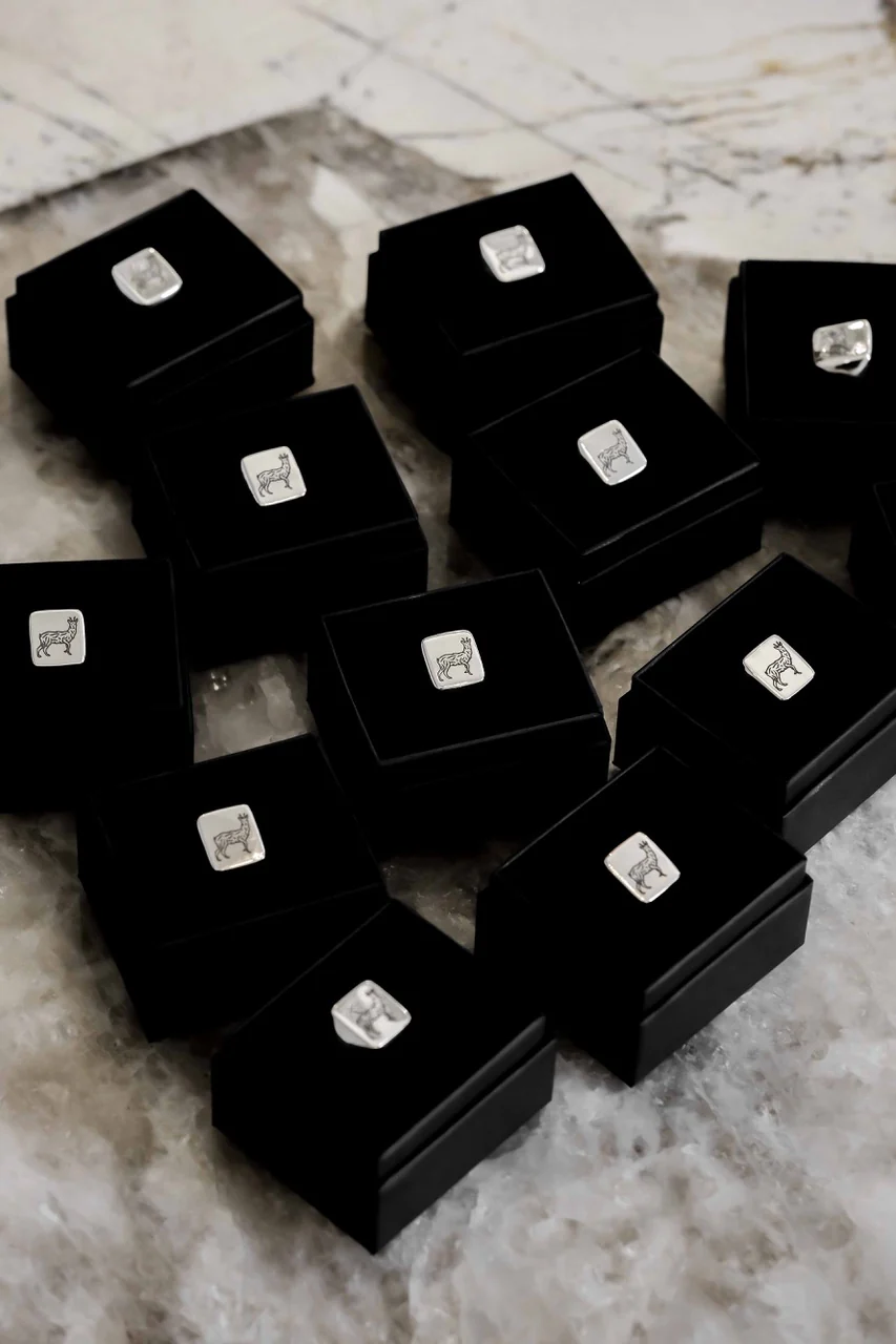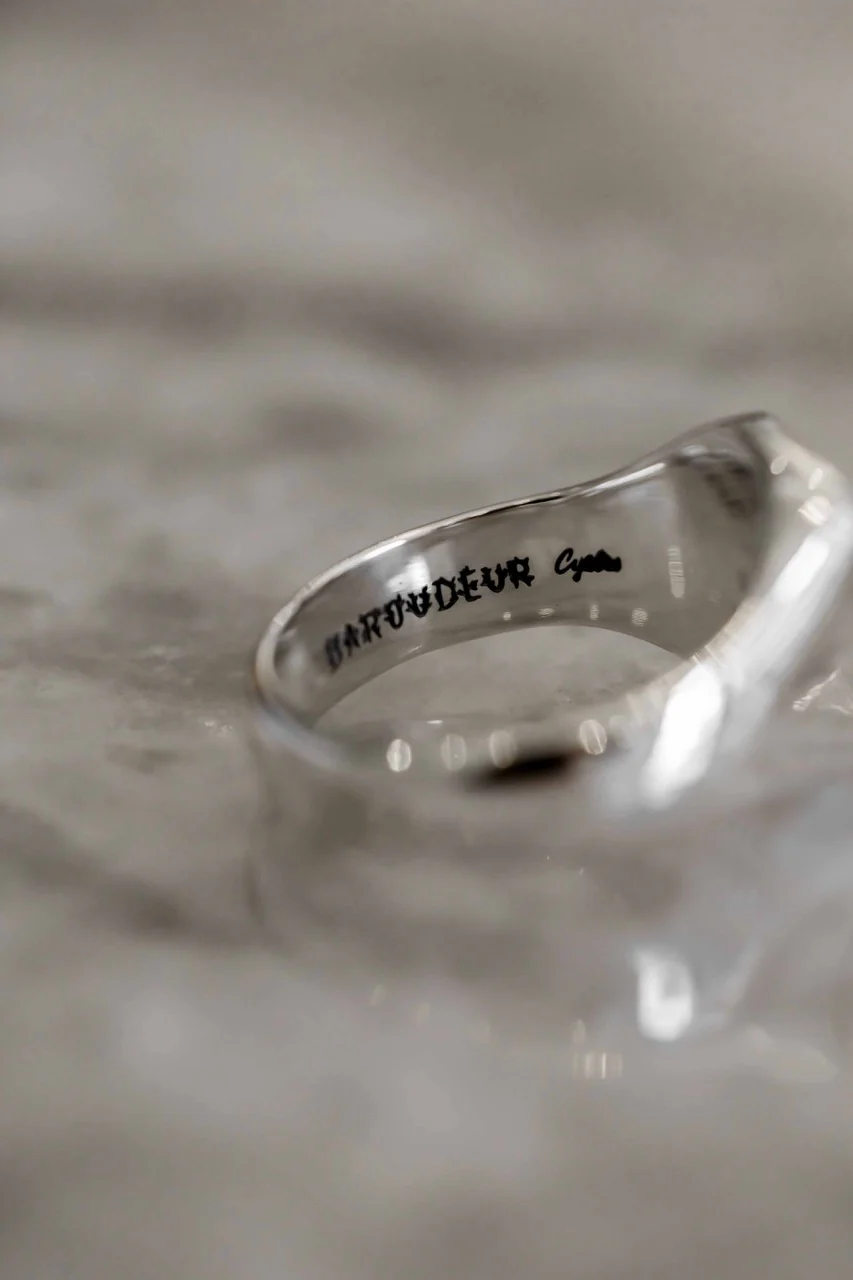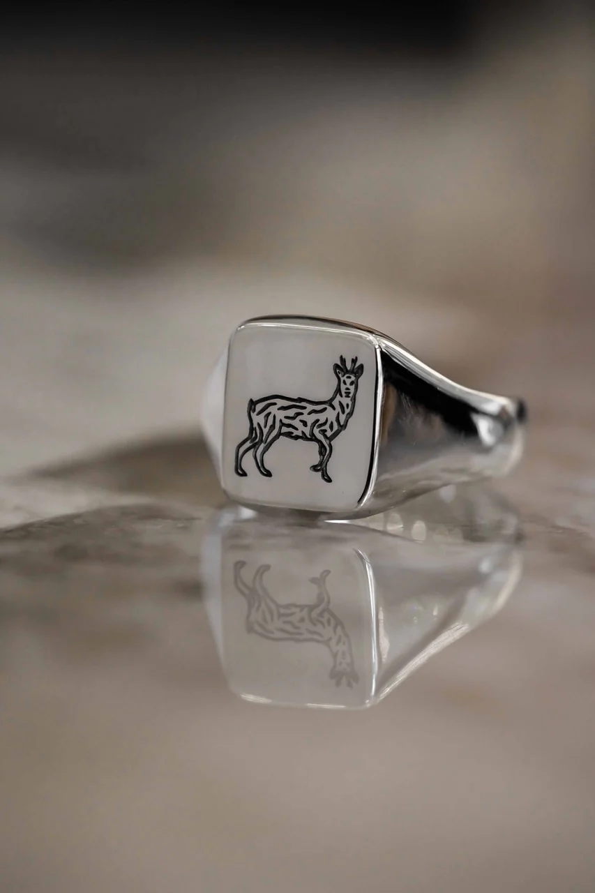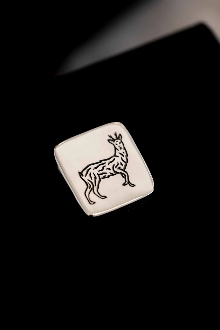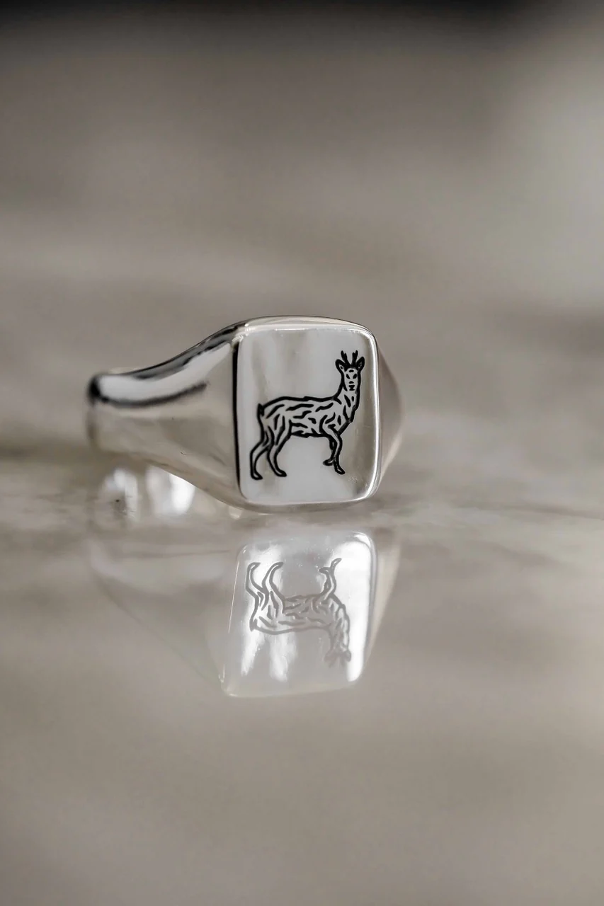 Chevalière en argent massif, estampillé du célèbre chevreuil Baroudeur Cycles, retravaillé pour l’occasion par Denis Carrier !