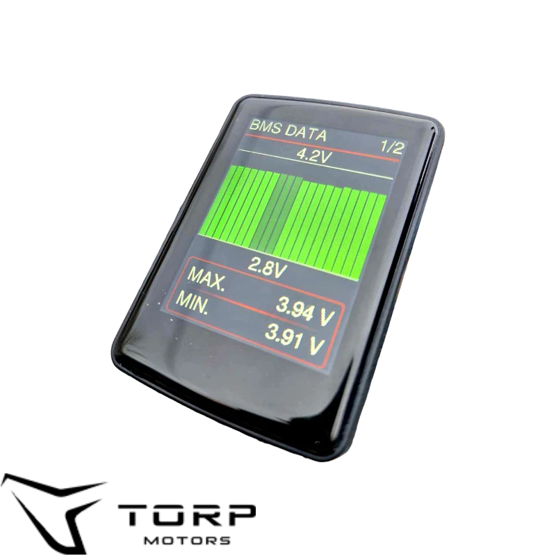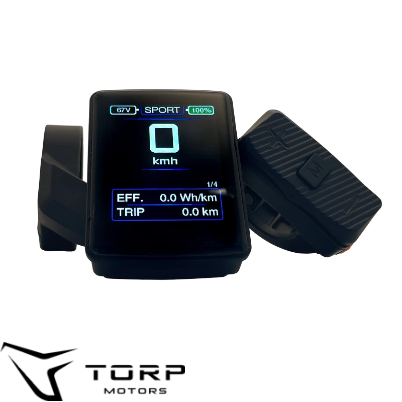 Le display couleur TORP est l’écran dédié aux contrôleurs TC500 et TC1000, idéal si vous ne souhaitez pas utiliser un smartphone en roulant. Compact et lisible, il affiche en temps réel les données clés du contrôleur et de la batterie : vitesse, mode, état de charge et paramètres essentiels. Le montage sur guidon est simple grâce aux bagues pour Ø 22,2 et 25,4 et 31,8 mm. L’ensemble se connecte directement au faisceau TORP ; si votre installation est en 3 connecteurs, prévoyez le faisceau 5 connecteurs pour assurer la compatibilité.