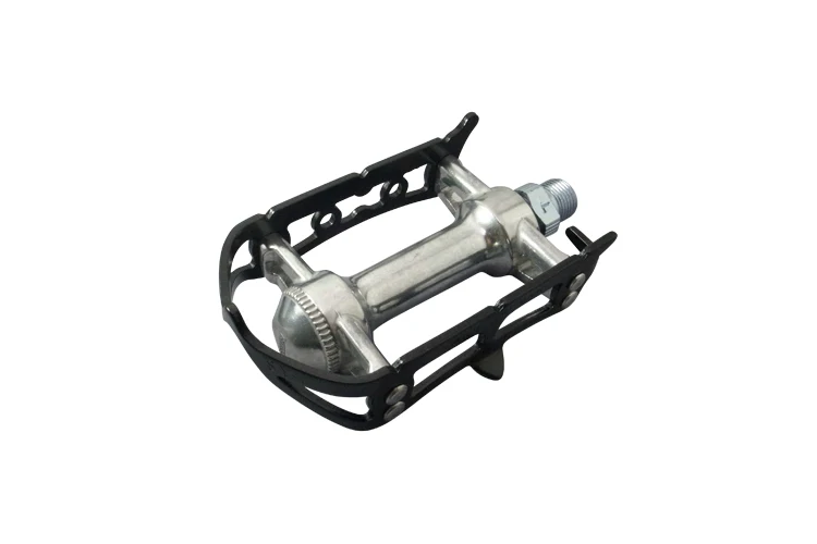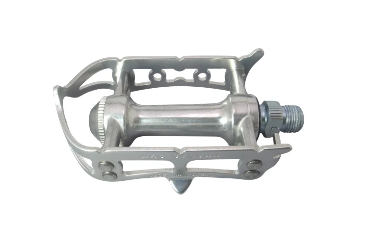 Les pédales Sylvan sont finies avec un corps couleur argent autour d’un axe zingué et sont disponibles avec des cage anodisées argentées ou noires.