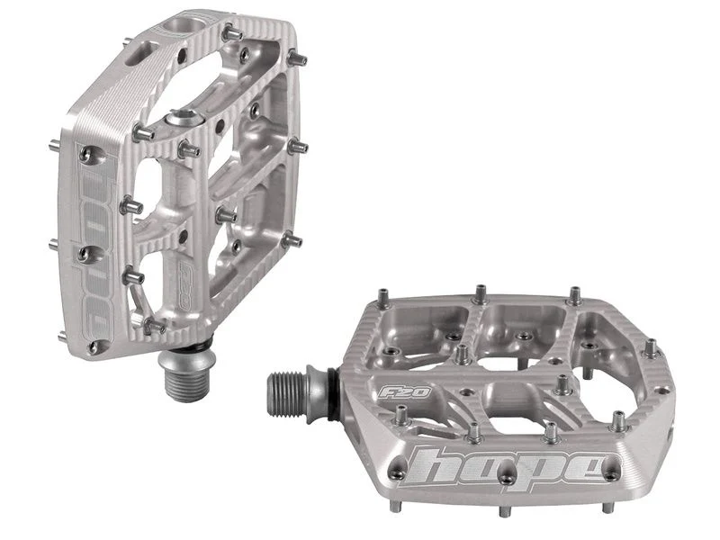 La pédale Hope F20 est entièrement usinée à partir d’un bloc d’aluminium T6 offrant une forme légèrement concave et rainurée pour plus de grip.
