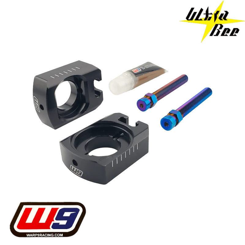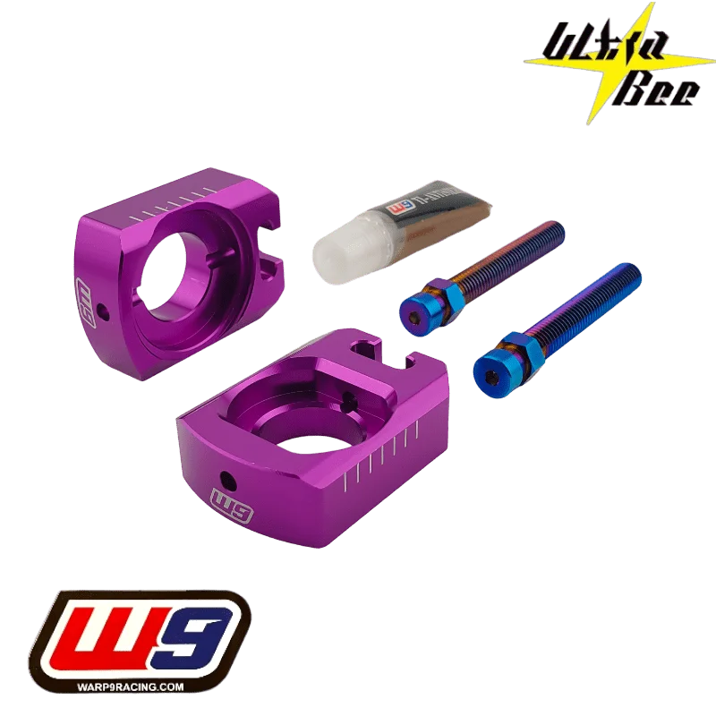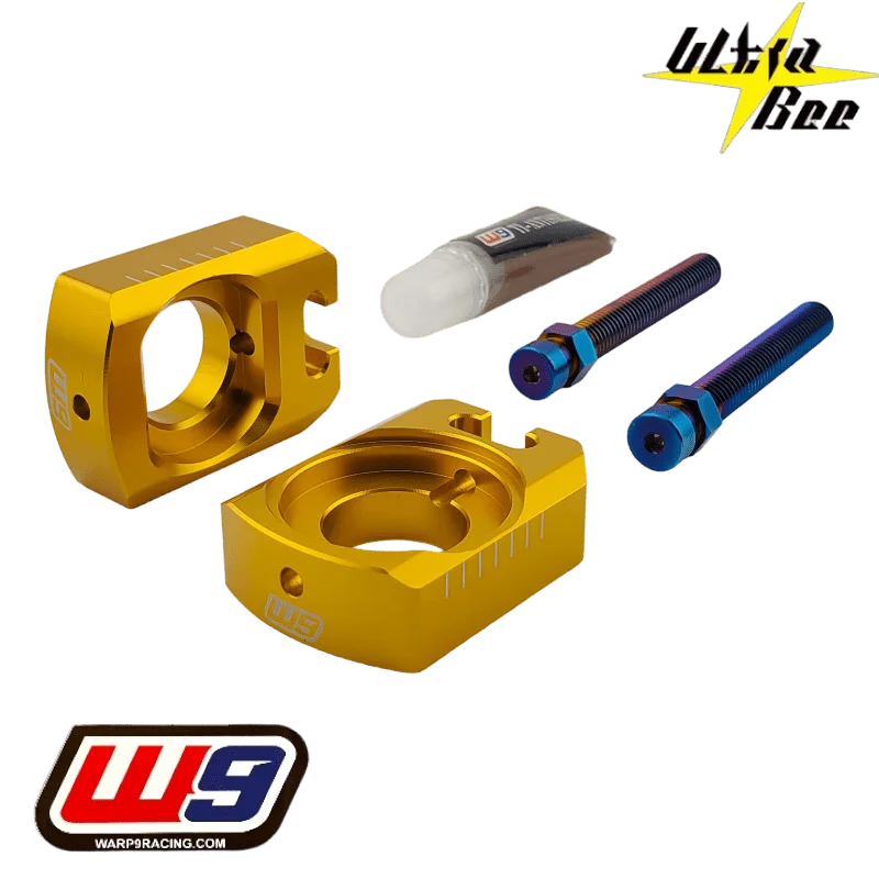 Le tendeur de chaîne WARP9 pour SUR-RON Ultra Bee combine performance et fiabilité grâce à sa conception haut de gamme. Les blocs d’essieu en aluminium usiné sont clavetés pour empêcher toute rotation lors du serrage ou du desserrage de l’axe. Les boulons de réglage M8 en titane bleu brûlé, dotés d’un système de bloc captif, maintiennent la tension de chaîne stable et sécurisée. Ce kit inclut un lubrifiant cuivre antigrippant, garantissant des réglages fluides et sans corrosion pendant des années, même en conditions tout-terrain exigeantes.
