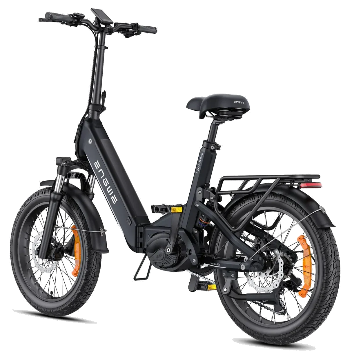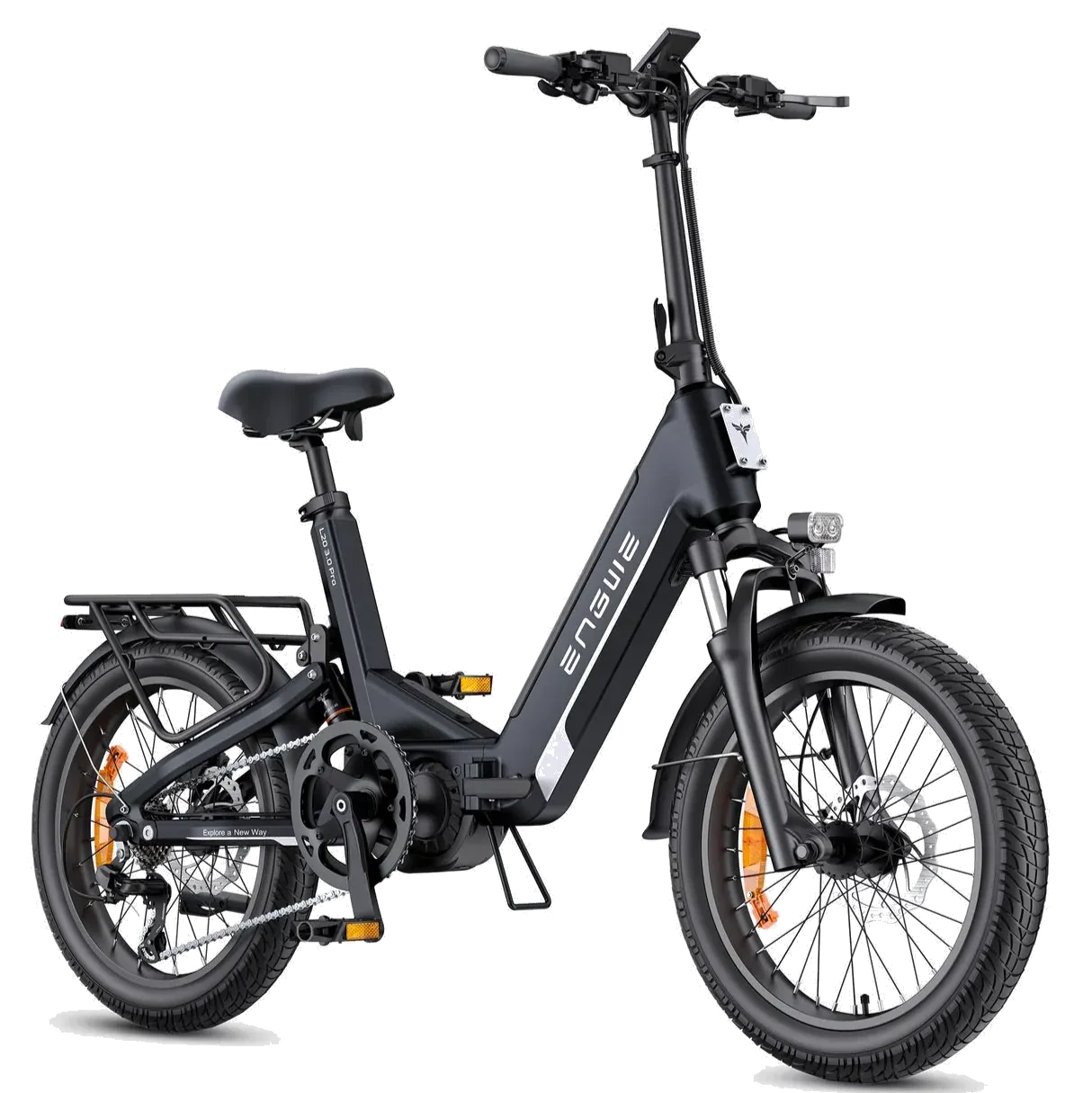 Qui dit vélo tout-suspendu dit confort : la fourche amortie à l’avant et la suspension à l’arrière absorbent les chocs et les nids-de-poule. Avec ses pneus larges de 20 x 3.0 pouces renforcés anti-crevaison, le L20 3.0 Pro reste stable aussi bien sur les pavés urbains que sur les chemins de terre. La position de conduite droite, la selle épaisse et le cadre ouvert garantissent un confort durable, même lors de longues balades.
