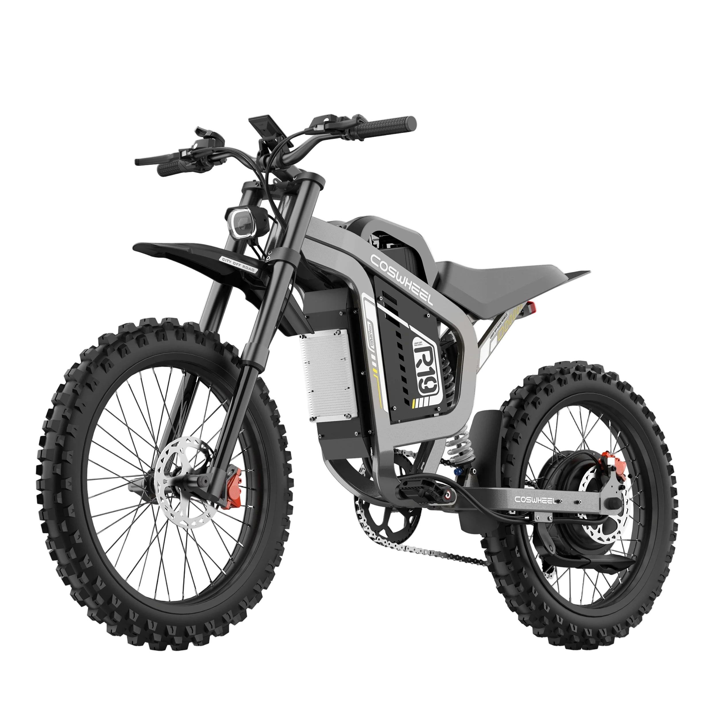 Le Coswheel R19 est un vélo électrique de type dirt bike conçu pour repousser les limites du tout-terrain. Puissant, endurant et agile, il offre des sensations dignes d’une moto tout en conservant l’esprit du VTT électrique. Grâce à son moteur brushless de 3 000 W, sa batterie lithium 72 V 40 Ah et ses suspensions longue course, le R19 allie performance brute, autonomie et plaisir de pilotage. Il s’adresse à ceux qui veulent un vélo capable d’affronter aussi bien les chemins forestiers que les pistes caillouteuses ou sablonneuses.